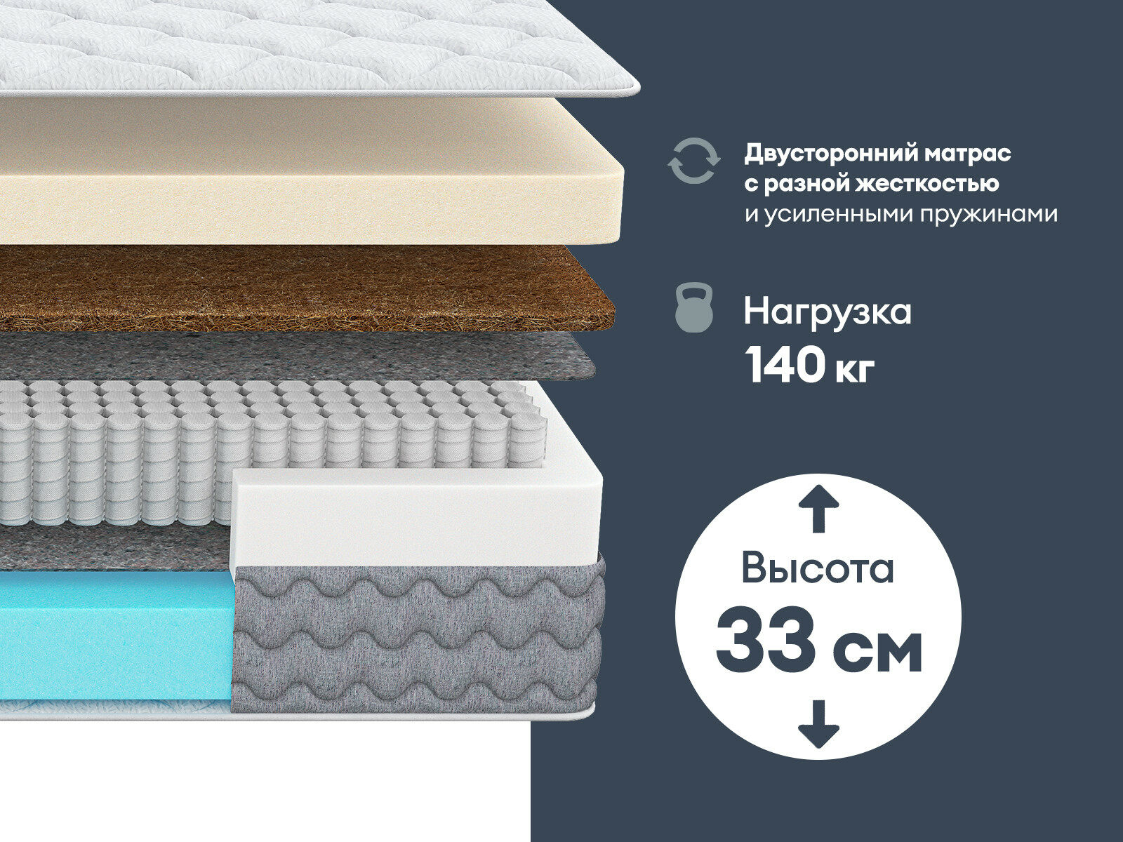 Матрас Димакс Биг Лайт Найт — это высокая пружинная модель с двумя сторонами комфорта. Классический средний уровень жёсткости и увеличенный пружинный блок дают надёжную поддержку и комфорт во время сна. Модель универсальна и подойдёт для удобного отдыха для разных типов фигур и телосложений.