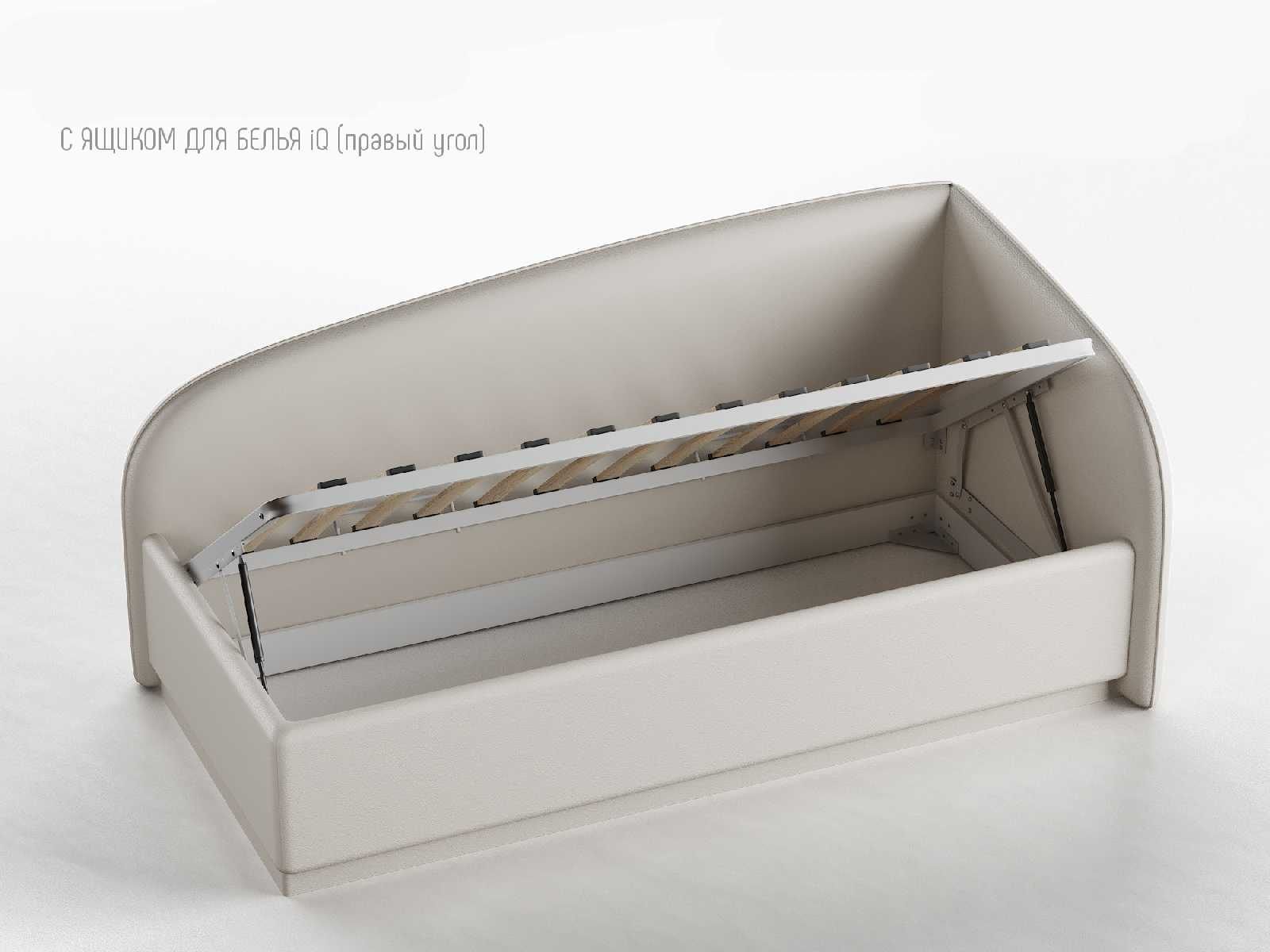 Кровать укомплектована IQ с подъемным механизмом и ящиком для белья без дна (дополнительная платная опция - дно к ящику IQ из HDF (ХДФ). Каркас кровати на цоколе, декоративный чехол на цоколе съёмный. Глубина ящика для белья - 30 см, без ограничения нагрузки на ящик.