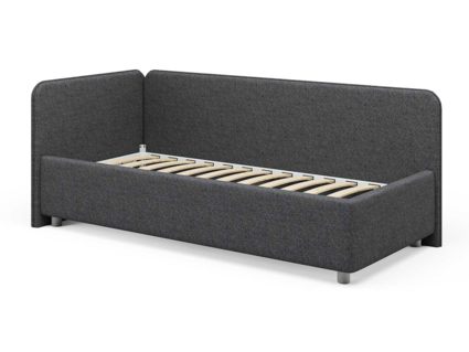 Односпальная кровать в современном стиле. Кровать-софа с одной боковой спинкой. Идеально подходит для квартир с небольшой площадью, детских и подростковых спален, гостевых комнат. Боковую спинку кровати можно изготовить на выбор на правую или левую сторону. Модель изготовлена из ДСП. При необходимости, кровать можно укомплектовать подъемным механизмом с бельевым ящиком.