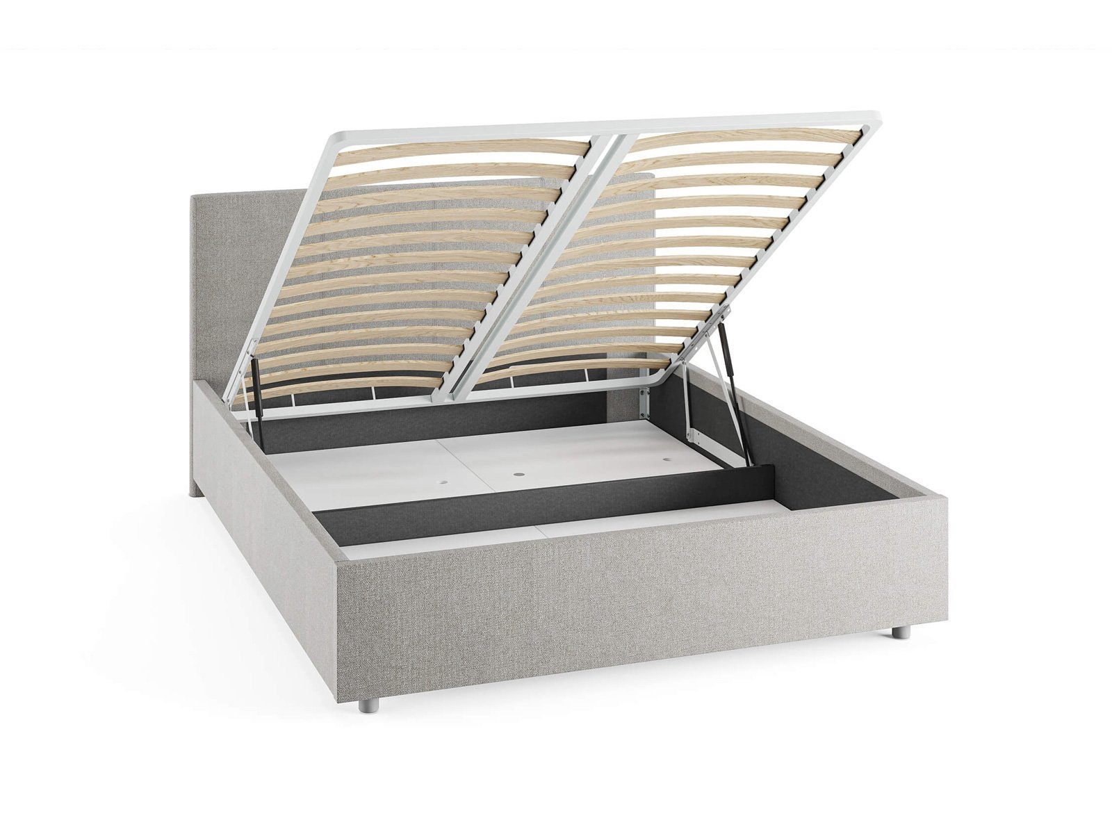 Кровать комплектуется металлическим основанием и подъемным механизмом со вместительным бельевым ящиком. Дно бельевого ящика легко сдвигается для обеспечения уборки под кроватью.