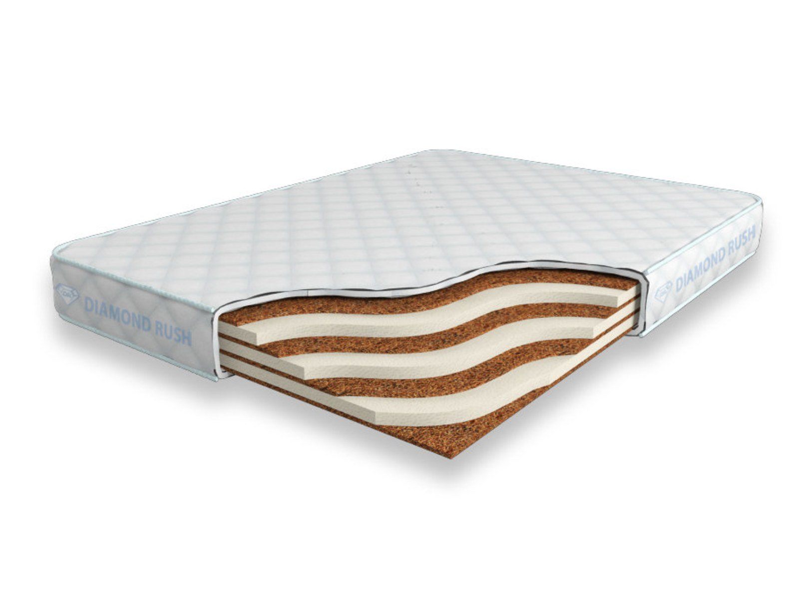 Матрас Diamond Rush Mono Mix Cocos 13 SD является беспружинным, т.е. не имеет в своей основе пружинного блока. В его состав входят одно или несколько чередований слоев латексированной кокосовой койры (1см) и искусственного латекса (3см). Такая модель матраса относиться к среднежестким и обладает средним ортопедическим эффектом.