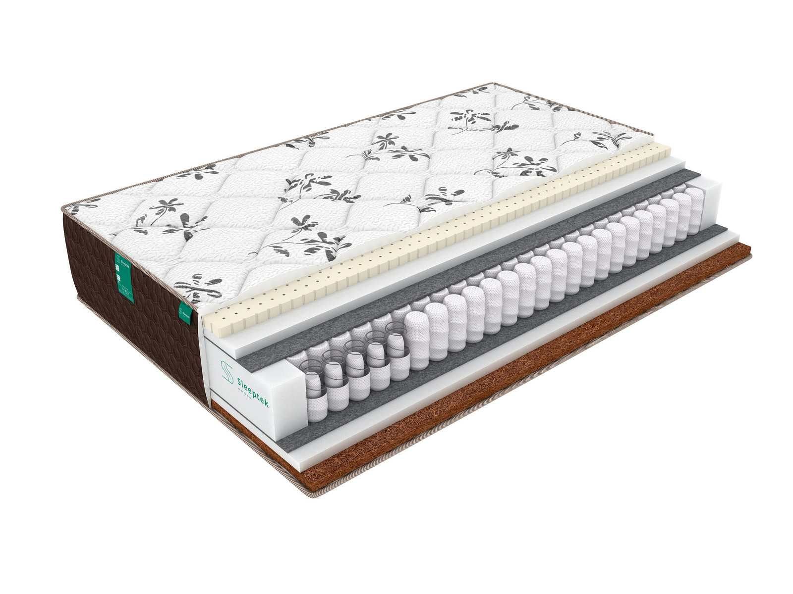 Блок пружин отделен от наполнителей изолирующими слоями термовойлока. Этот плотный материал защищает наполнители от контакта с пружинами и продлевает срок эксплуатации матраса