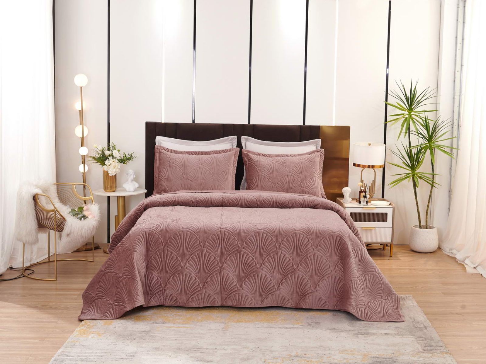 Роскошное велюровое покрывало Ариэль станет изюминкой любого интерьера, ведь оно потрясающе выглядит и приятное на ощупь. Обратите внимание на стежку покрывала – она выполнена в виде ракушек с эффектом 3D. Из-за особого плетения, велюровая ткань покрывала отражает свет и красиво переливается при различном освещении.